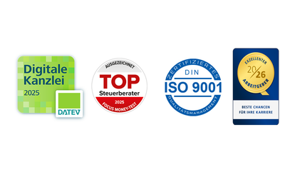 Wir erhalten regelmäßig Auszeichnungen, darunter die Anerkennung von Focus Money als "Top Steuerberater". Zudem nennen wir uns stolz digitale DATEV-Kanzlei, denn wir leben Digitalisierung, statt nur darüber zu reden. Des Weiteren sind wir DIN EN ISO 9001 zertifiziert und glänzen mit top Qualitätsmanagement.